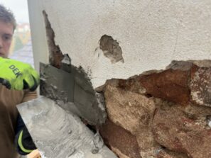 Postup je vždy stejný: nejprve odstraníme všechny duté a nedržící části, které by stejně časem odpadly samy. Poté nahodíme novou omítku a provedeme finální nátěr. Výsledek je funkční a vizuálně čistý.