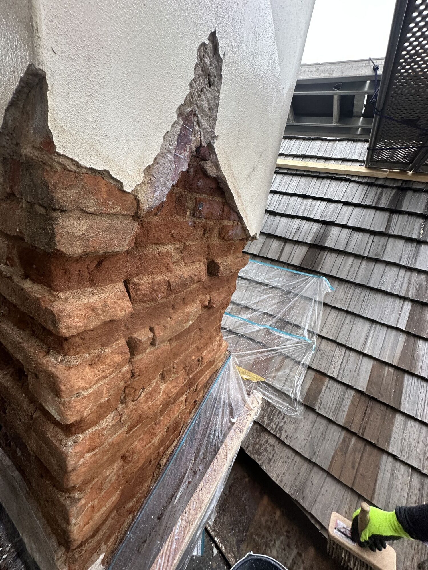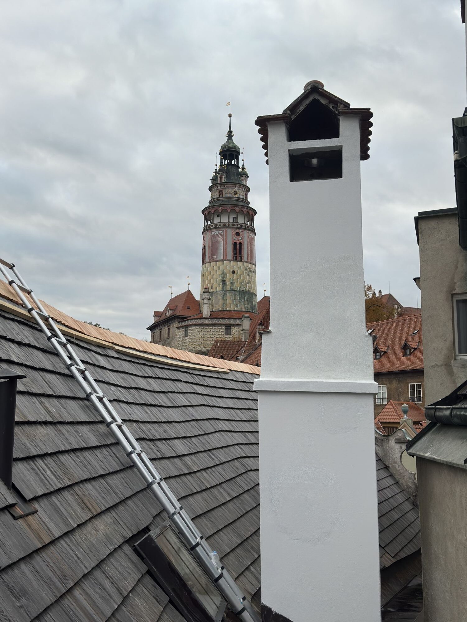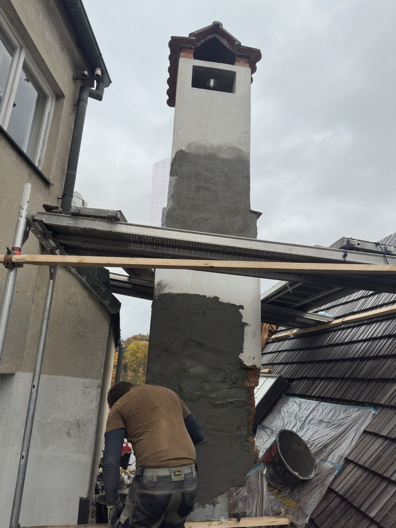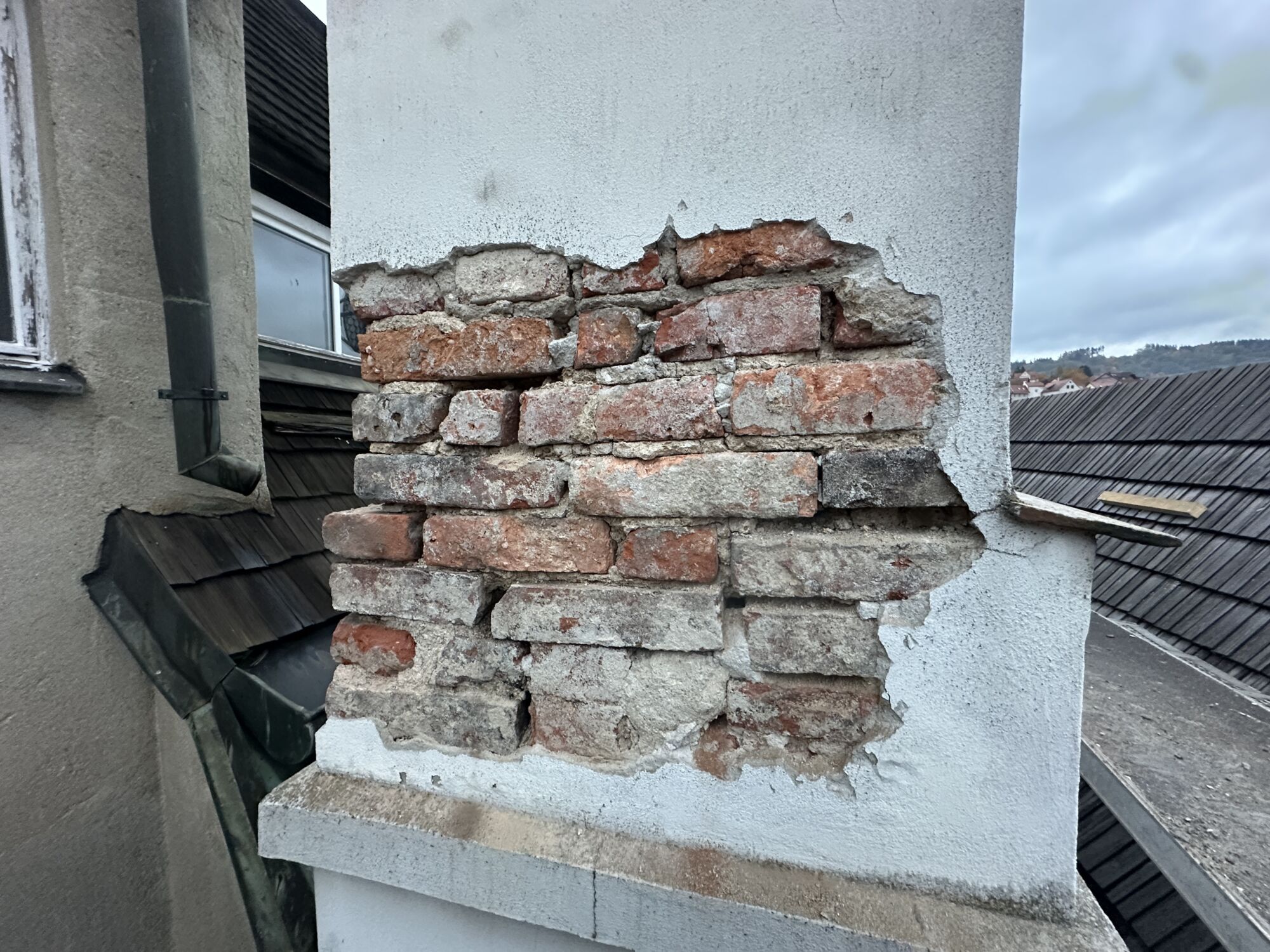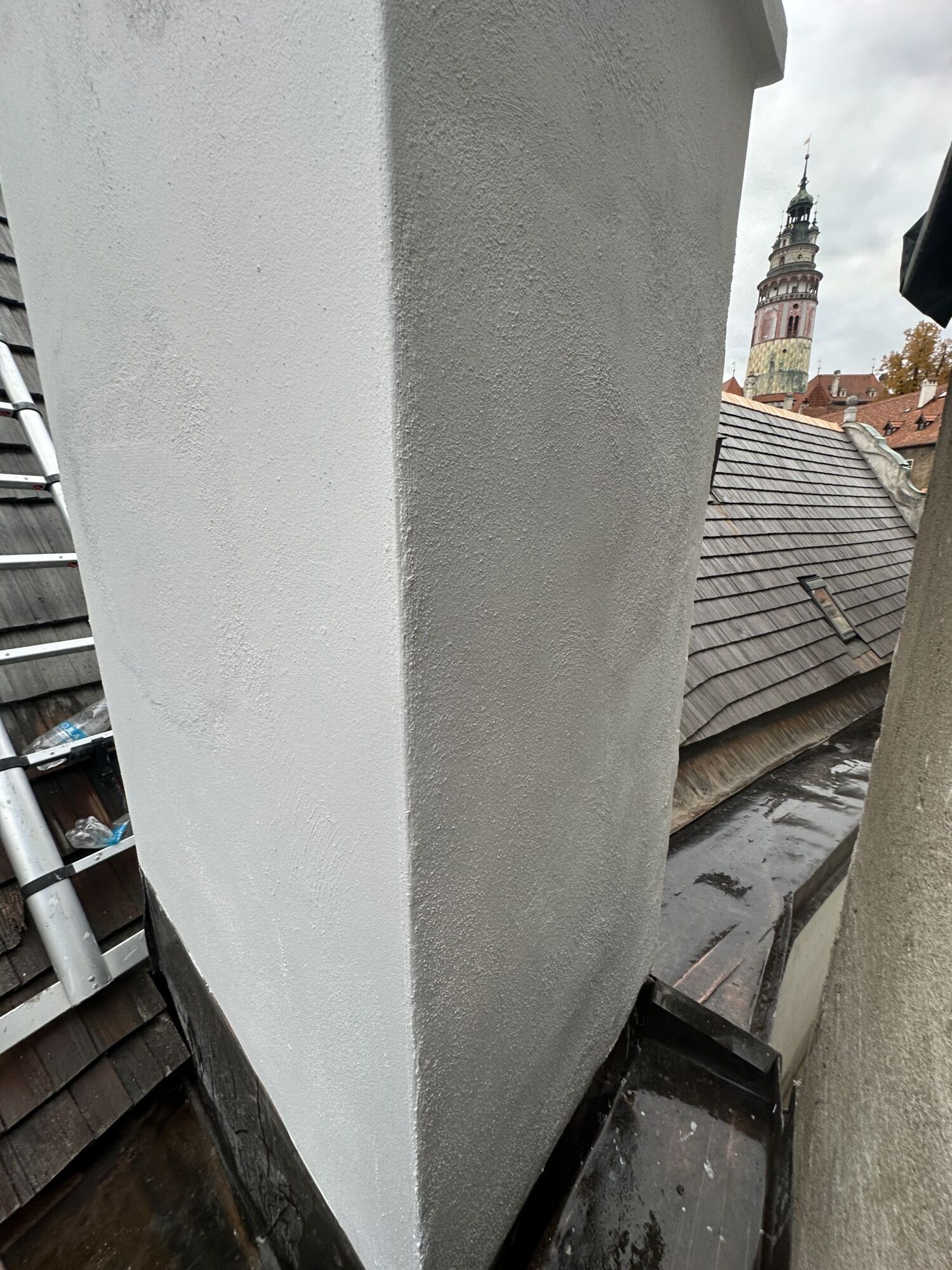 Opravy komínů provádíme jako součást našich střešních realizací. Řešíme dva nejčastější problémy — poškozené spárování a popraskané omítky.